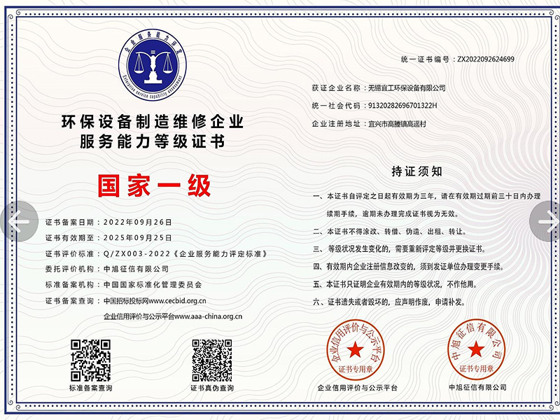 • 環(huán)保設(shè)備制造維修企業(yè)服務(wù)能力等級(jí)證書